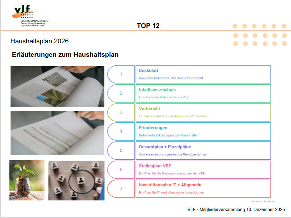 Inhaltliche Impulse gaben Frau Dr. Paul-Pollack, Präsidentin des Landesamtes für Ländliche Entwicklung, Landwirtschaft und Flurneuordnung (LELF), sowie Herr Johannes Funke, MdL, Vorsitzender des Ausschusses für Europaangelegenheiten und Entwicklungspolitik. Beide Referenten beleuchteten aktuelle Herausforderungen und Perspektiven und gaben Anregungen für die zukünftige Verbandsarbeit im ländlichen Raum Brandenburgs.