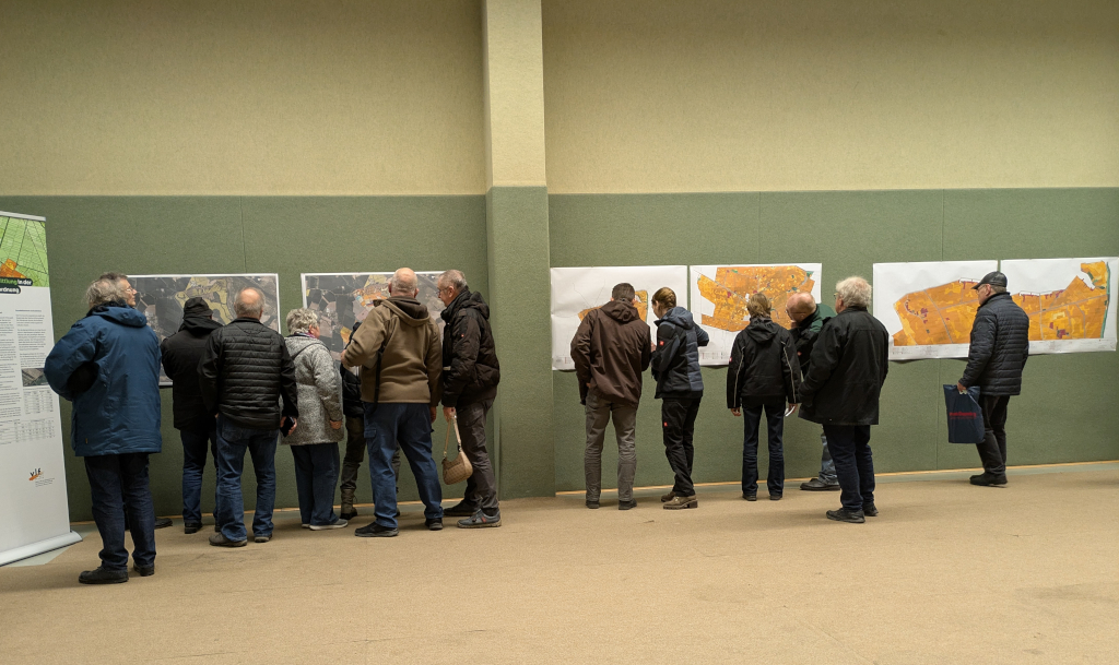 Auch im Anschluss an den offiziellen Teil kam es in kleineren Gruppen zu Gesprächen über die vorgestellten Themen. Anhand der ausgehängten Karten konnten die Besucher bereits einen ersten Blick auf die Wertklassenflächen ihrer eigenen Flurstücke werfen. Ab dem 02. März 2026 werden diese Unterlagen in den Gemeinden sowie auf der Verfahrensseite zum Verfahren Zechin zur detaillierten Einsicht bereitstehen.